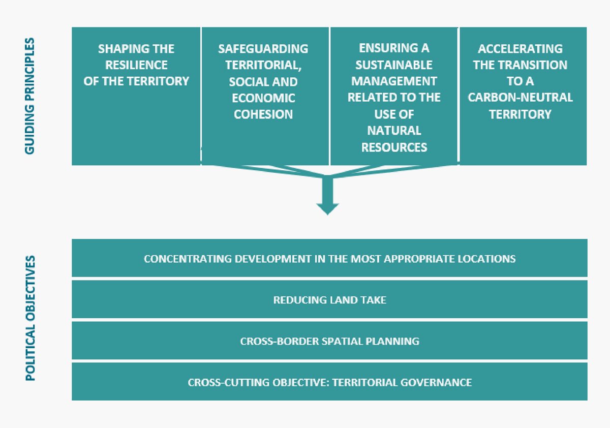 The PDAT defines three political objectives and one cross-cutting objective. Their definition was shaped by four guiding principles for spatial planning whose aim is to further the ecological transition of Luxembourg’s territory.